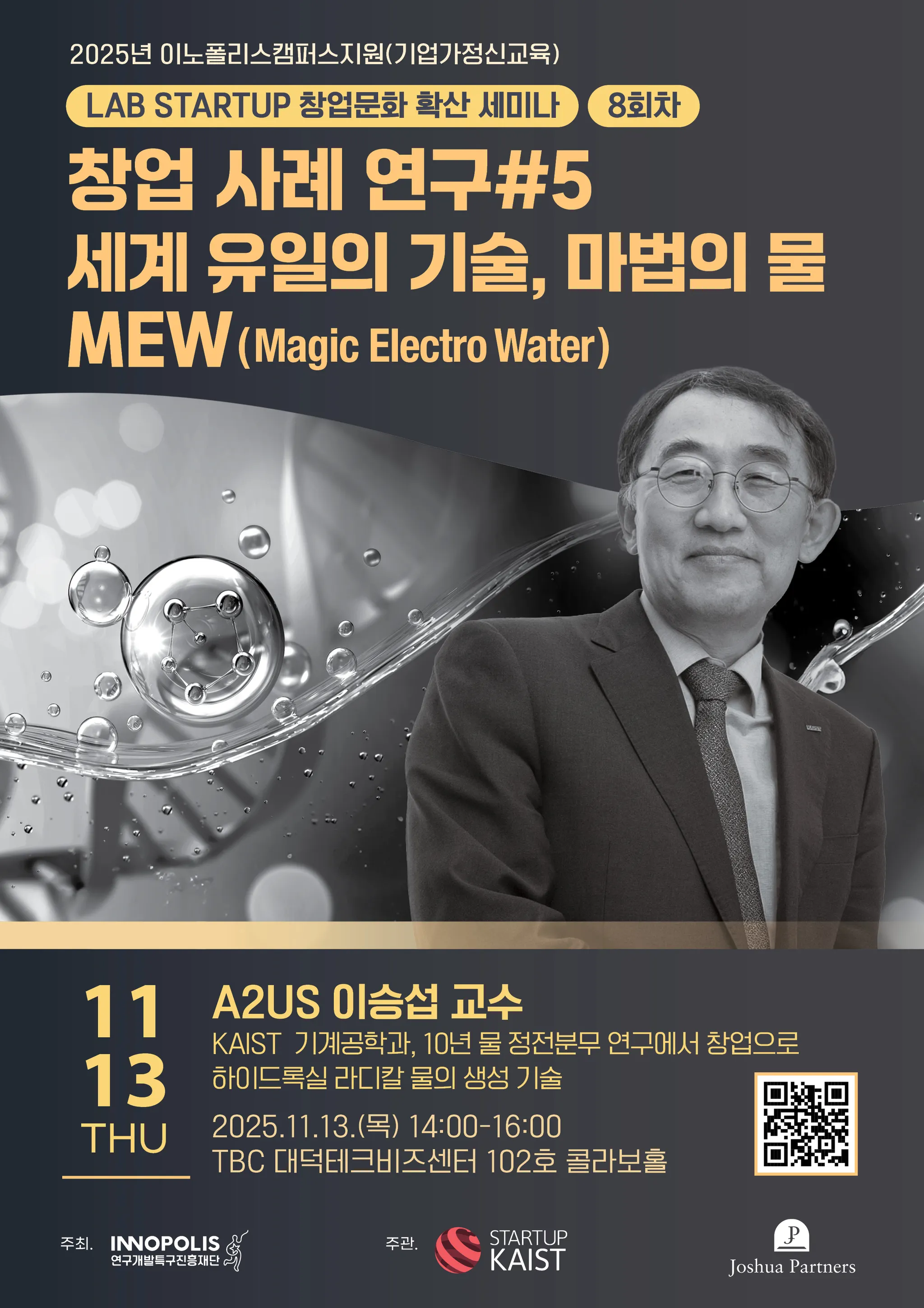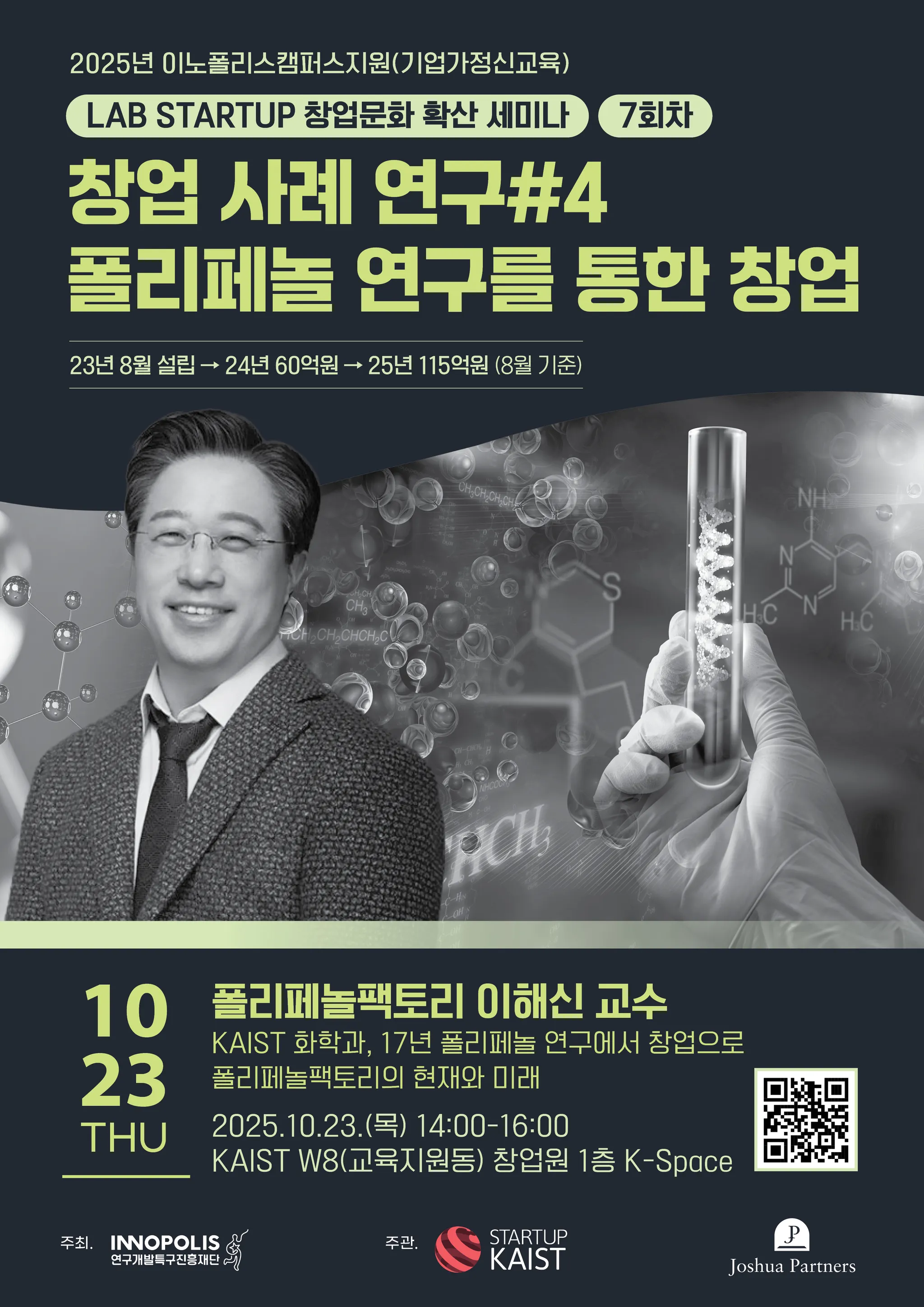 본 프로그램은 연구개발특구진흥재단이 주최하고, KAIST 창업원과 조슈아파트너스가 주관하는 기업가정신 교육 · 세미나 프로그램입니다. 2026년 3월까지 매달 1회 이상 개최될 예정이오니, 해당 홈페이지를 참고해 주시길 바랍니다.